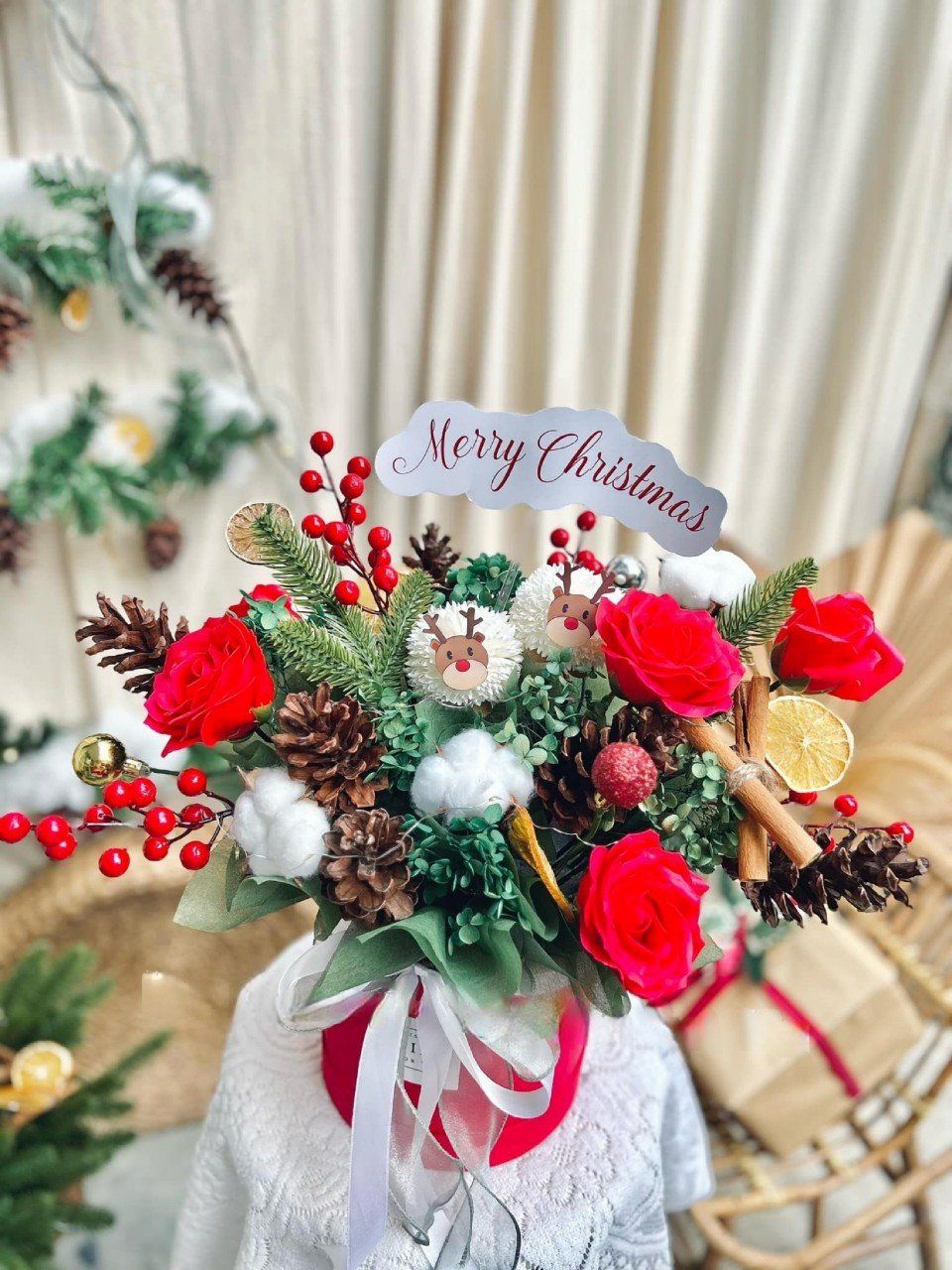 Nếu bạn đang phân vân chọn một món quà cho dịp lễ giáng sinh năm nay thì hãy thử xem qua mẫu Lẵng hoa noel tone đỏ xanh của Hin Florist nhé. Sự kết hợp giữa các nguyên vật liệu sấy khô cao cấp nhập khẩu như hoa gòn, lát cam, quả thông và các vật liệu trang trí giáng sinh điển hình tạo nên 1 món quà vô cùng đặc sắc. Đặc biệt nhất là mẫu hoa có thể lưu giữ mãi mãi mà không sợ tàn phai như hoa tươi sẽ giúp món quả của chúng ta càng thêm phần ý nghĩa.